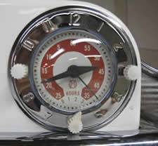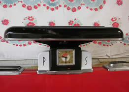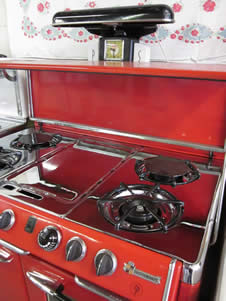 Only 700-800 of these premium luxury estate home stoves were ever made. The O'Keefe and Merritt factory took a standard single oven 40 inch range and added a left or right stack with an additional oven, a warming oven and a broiler to create the "Aristocrat". This stove was produced for the highest-end homes of the time and includes 2 ovens, 2 broilers, a warming oven, 2 pot storage drawers and a special "grillevator", a broiler with an elevating grille which can be moved to 5 different settings in relation to the flame. The chrome cook top has six burners with special mini-simmer burners in the center. The insulated ovens are gas (natural or propane) for exceptional pastry baking and cakes and come with windows for viewing. |